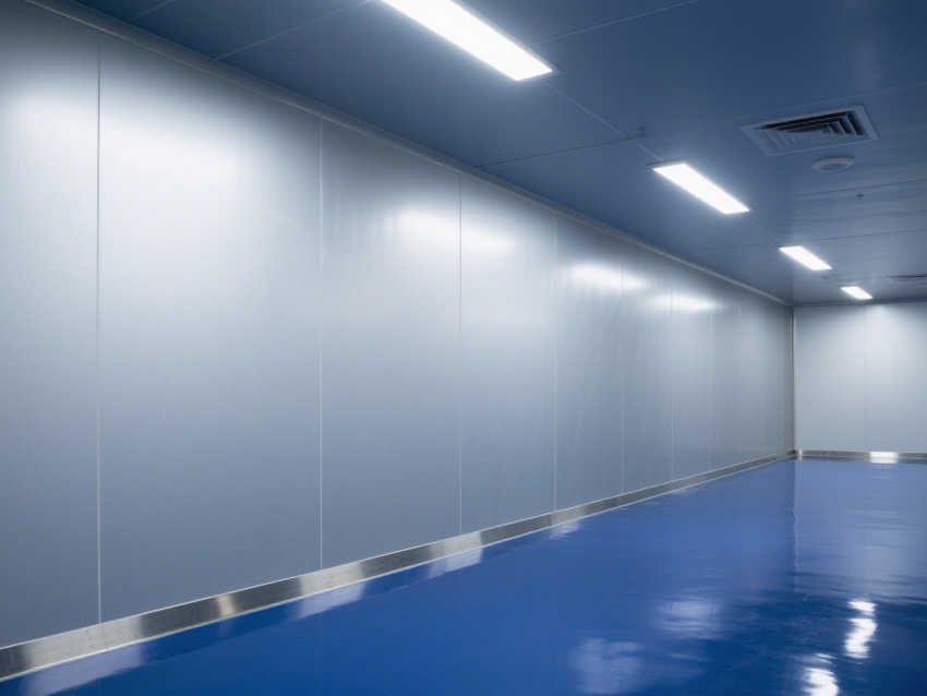 車間內(nèi)部整體呈銀灰色和藍(lán)色,給人一種現(xiàn)代感和科技感。墻面、地面和天花板均采用無縫設(shè)計(jì),便于清潔和消毒,防止灰塵和微粒的積聚。照明系統(tǒng)明亮且均勻,提供了良好的工作環(huán)境。