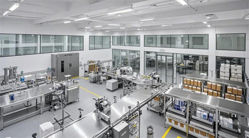 2000平方米化妝品車間,現代潔凈風格。車間分為生產區、包裝區、原料存儲區和辦公區。生產區占50%,包裝區占30%,原料存儲區占10%,辦公區占10%。生產區:防靜電環氧地坪(淺灰色),白色彩鋼板墻面和天花板,頂部高效過濾器(HEPA),不銹鋼工作臺,設備排列整齊。包裝區:自動化包裝流水線,地面為防靜電PVC地板(淺色)。原料存儲區:貨架整齊,溫濕度控制。辦公區:玻璃隔斷,現代簡約辦公桌。整體色彩:白色、淺灰色、淺綠色點綴。